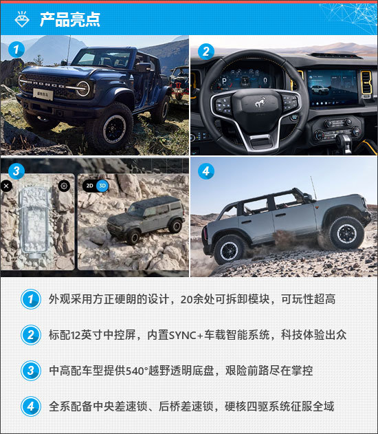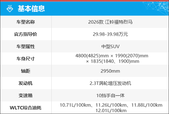2026款江铃福特烈马定位为中型SUV,共推出6款车型,官方指导价为29.98-39.98万元。车辆全系采用非承载式车身,具备低速四驱功能,是不折不扣的“越野利器”。
