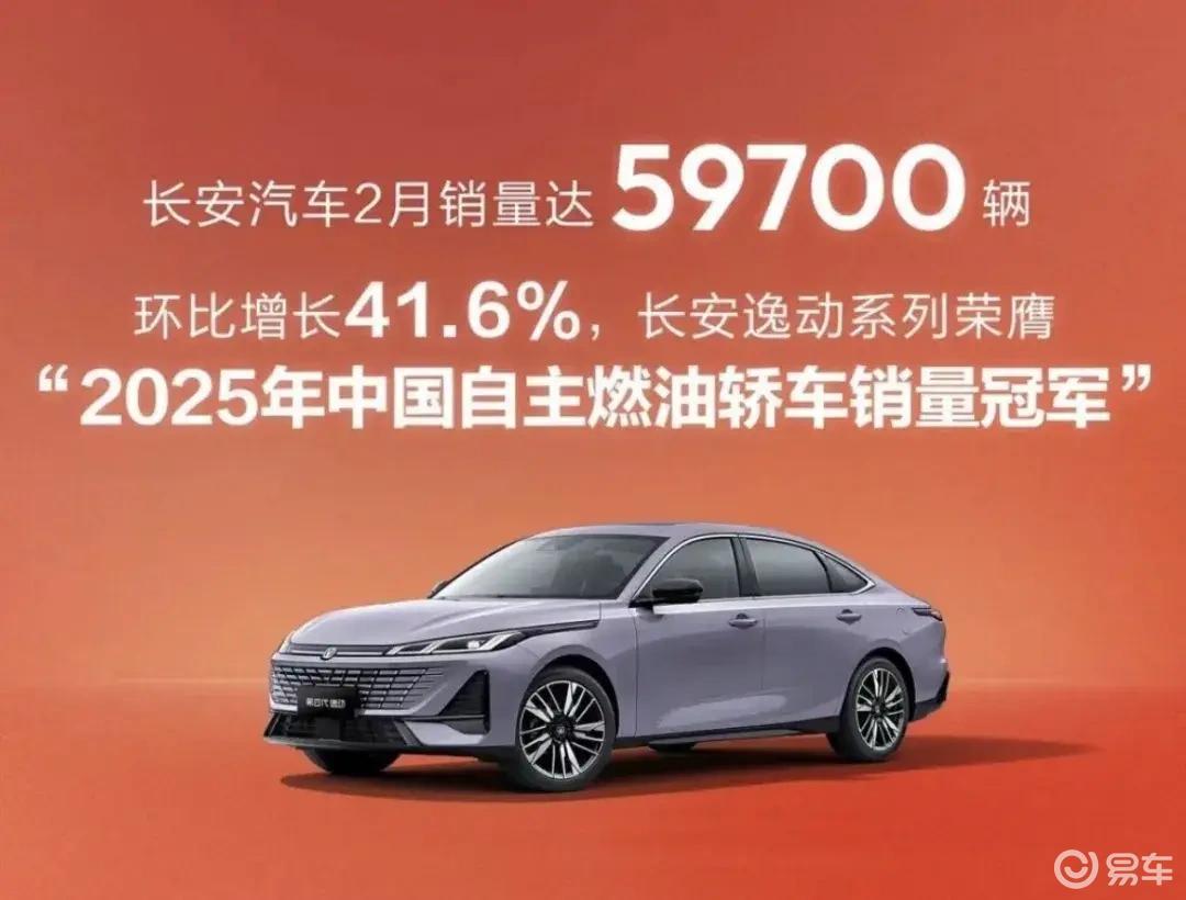 先看最让人意外的燃油车板块。在新能源渗透率持续走高、不少自主品牌纷纷收缩燃油车战线的当下,长安品牌燃油车2月销量达到59700辆,环比增长41.6%,这个增幅远超行业平均水平。更关键的是,逸动系列拿下“2025年中国自主燃油轿车销量冠军”,这一成绩的含金量在于,它身处的是10万级家用轿车市场——这是合资品牌深耕多年的基本盘,也是自主燃油车最难突破的领域。